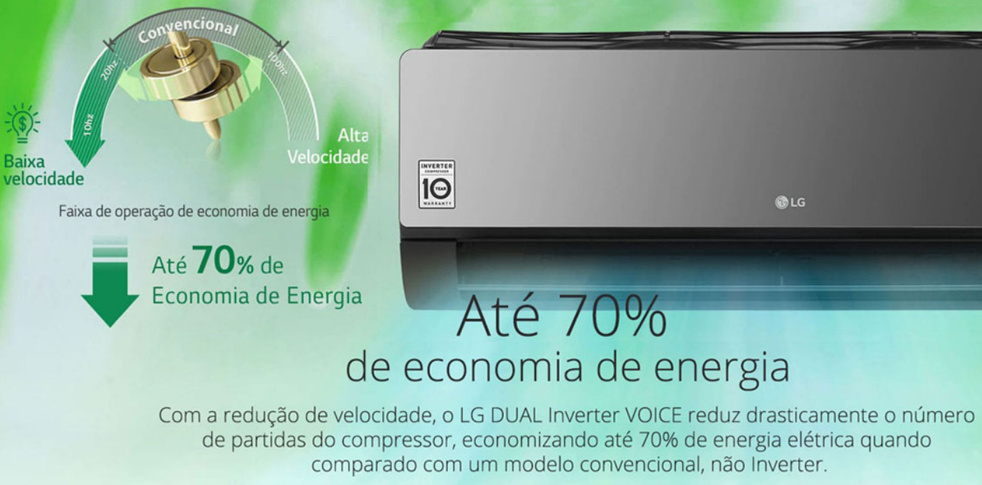 O Ar Condicionado Split Hi-Wall LG DUAL Inverter Voice tem capacidade de 12.000 BTU/h e funciona com voltagem de 220V.