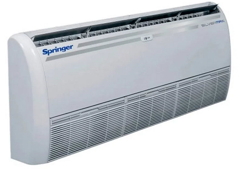 O Piso Teto Springer Silvermaxi é um dos menores condicionadores da categoria, com opção de instalação no piso ou no teto além de utilizar o gás R-410A.